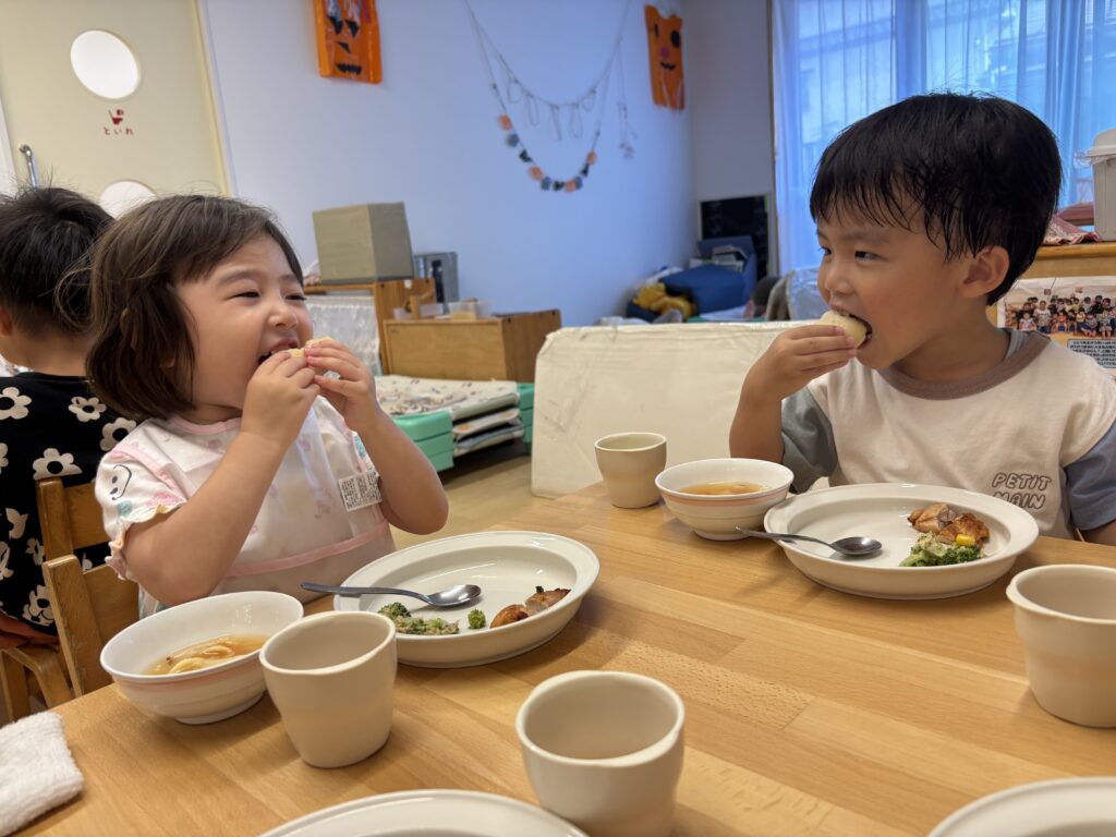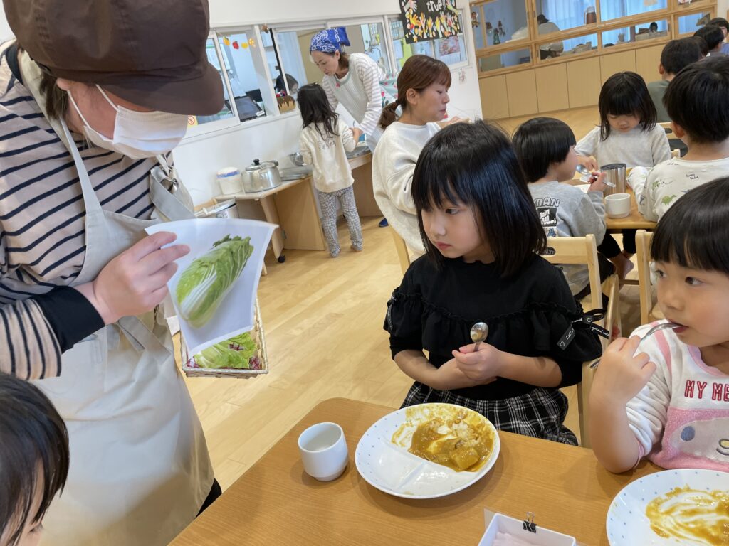 - 栄養士が食事の時間にランチルーム等で、食材の名前や働きについての話や食事のマナーについて知らせています。給食の先生がちょっとした時間に食事の様子を見に来たり、声をかけてくれることで身近な存在となっています。子ども達も「きょうのごはんなに~?」「今日お皿からっぽにしたよ~」と声をかけ毎日の食事を楽しみにしています。